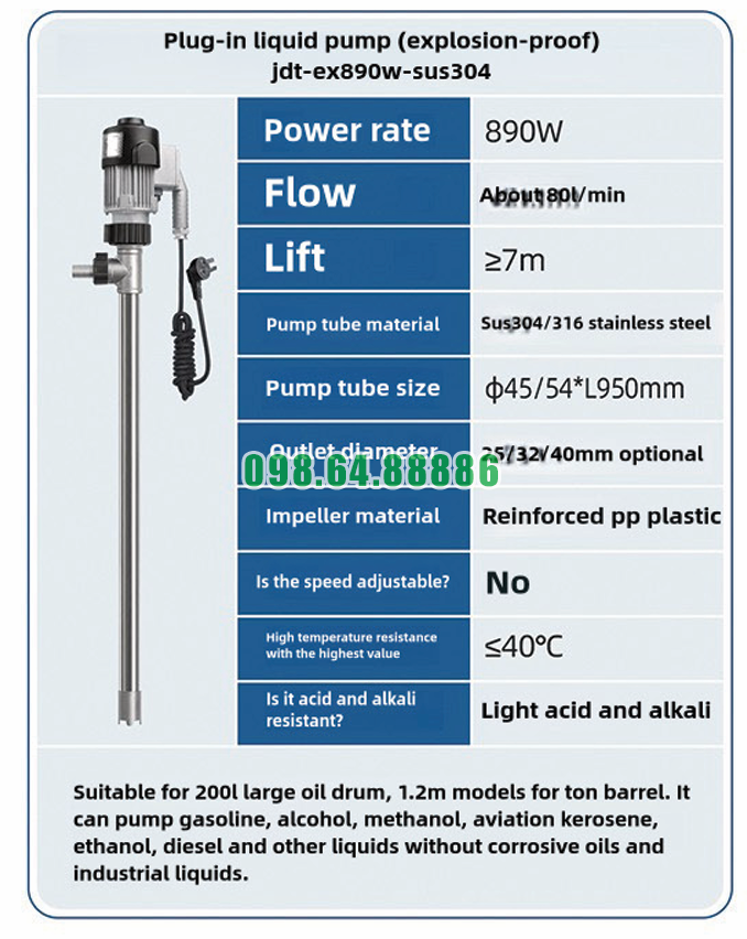 Máy bơm chất lỏng cắm trực tiếp chống cháy nổ JDT-EX890W-SUS304 được thiết kế hướng đến sự an toàn, ổn định và tối ưu cho môi trường dễ cháy nổ. Việc không tích hợp chức năng điều chỉnh tốc độ không phải là hạn chế, mà là một lựa chọn kỹ thuật có chủ đích nhằm đảm bảo hiệu quả vận hành và giảm thiểu rủi ro.