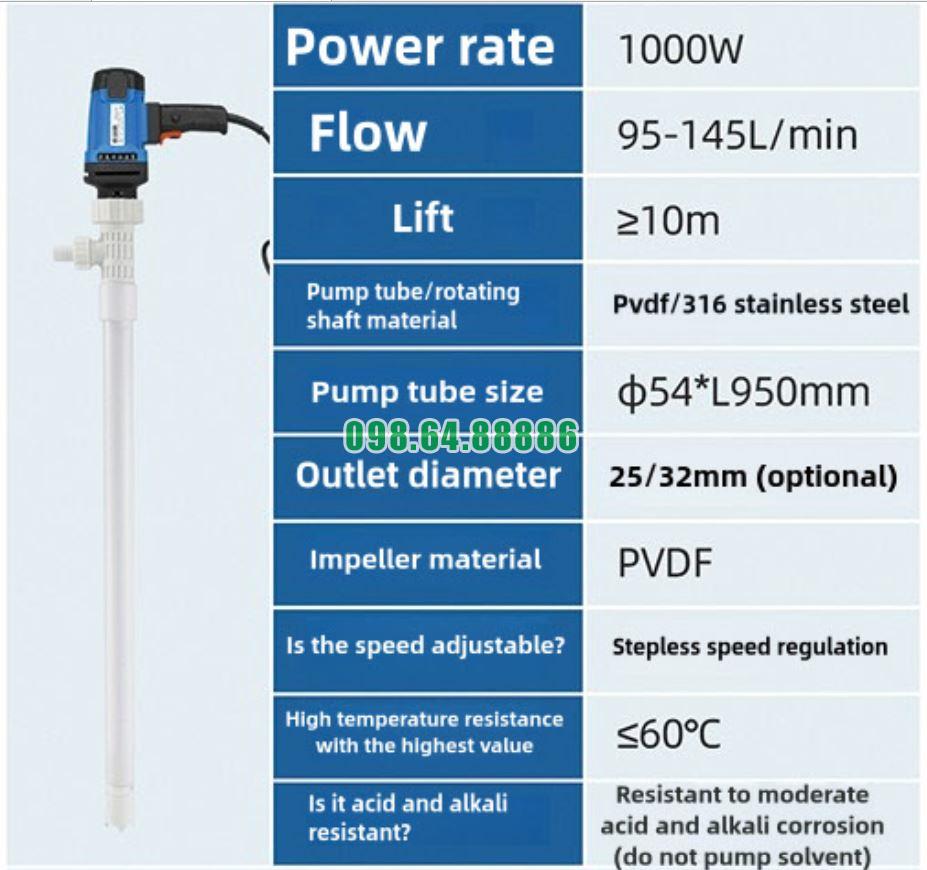Bơm cắm điện thùng phuy model JDT-1000W-PVDF có thể vận hành liên tục với hiệu suất ổn định, đáp ứng tốt yêu cầu bơm hút hóa chất trong các nhà máy và xưởng sản xuất.