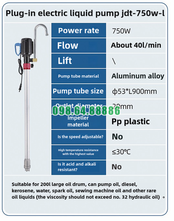 Máy bơm điện hút thùng phuy vỏ nhôm JDT-750W-L có thể được sử dụng để bơm nhiều loại chất lỏng khác nhau như dầu diesel, dầu hỏa, nước hoặc các loại dầu máy. Với thiết kế và chế độ vận hành đơn giản, máy phù hợp cho nhiều ứng dụng trong công nghiệp, xưởng cơ khí, hoặc các ngành công nghiệp cần chuyển tải chất lỏng từ thùng phuy sang các thùng chứa khác.