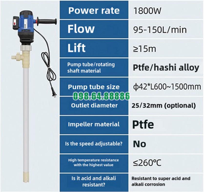 Ưu thế về công suất 1800W của Bơm điện thùng phuy 200L JDT-1800W-PTFE