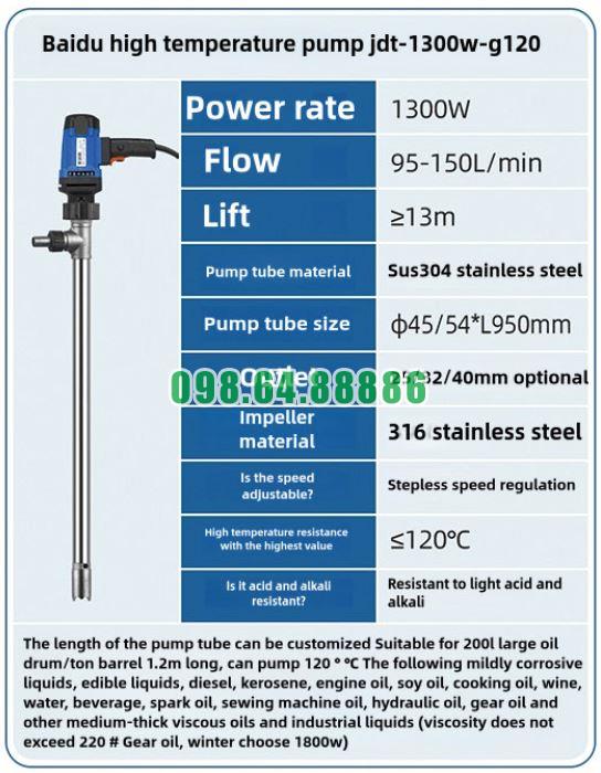 Thông số Bơm thùng phuy nhiệt độ cao JDT-1300W-G120