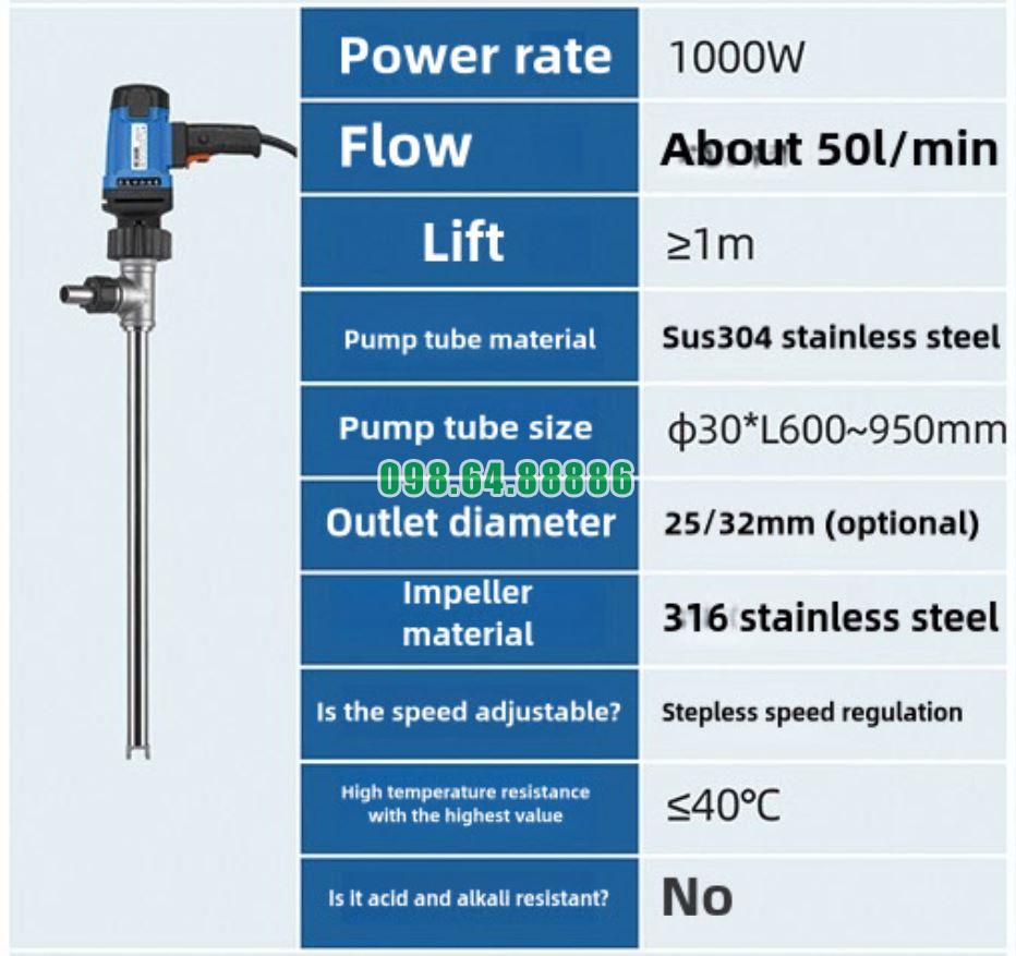 Ưu điểm của động cơ công suất 1300W của bơm thùng phuy inox chịu nhiệt JDT-1300W-G260 thể hiện ở khả năng vận hành ổn định, phù hợp với điều kiện bơm chất lỏng nhiệt độ cao, hạn chế quá tải và tăng độ bền thiết bị. Việc lựa chọn công suất 1300W giúp bơm đáp ứng tốt yêu cầu sử dụng trong môi trường công nghiệp, đồng thời đảm bảo hiệu quả và an toàn trong quá trình vận hành.