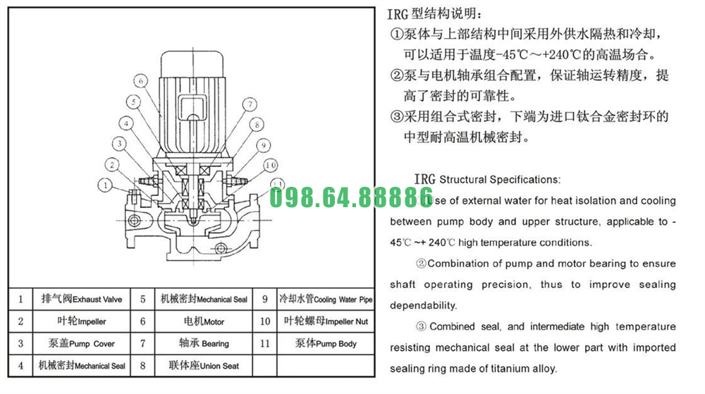 Bơm có cấu trúc liền trục giữa động cơ và thân bơm, loại bỏ nhu cầu sử dụng khớp nối trung gian, giảm tổn thất năng lượng và hạn chế điểm mài mòn.