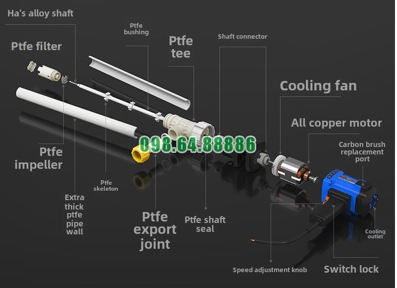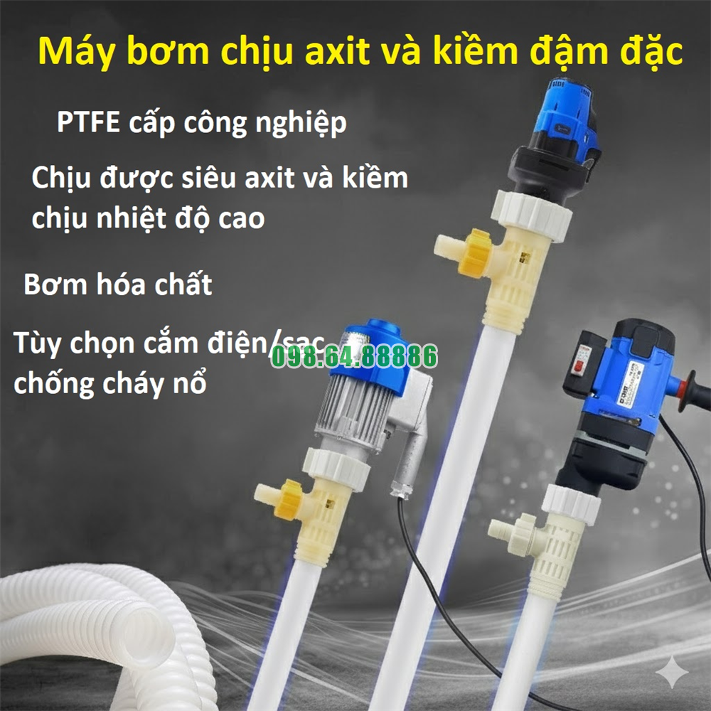 Nhờ vật liệu PTFE (Teflon) có tính trơ hóa học, bơm có thể sử dụng để hút các loại hóa chất ăn mòn mạnh, như axit, kiềm, dung môi hữu cơ, chất tẩy rửa hoặc dung dịch phản ứng công nghiệp. Điều này giúp bơm linh hoạt sử dụng với nhiều loại bồn chứa khác nhau, mà không lo bị hư hỏng hay rò rỉ.