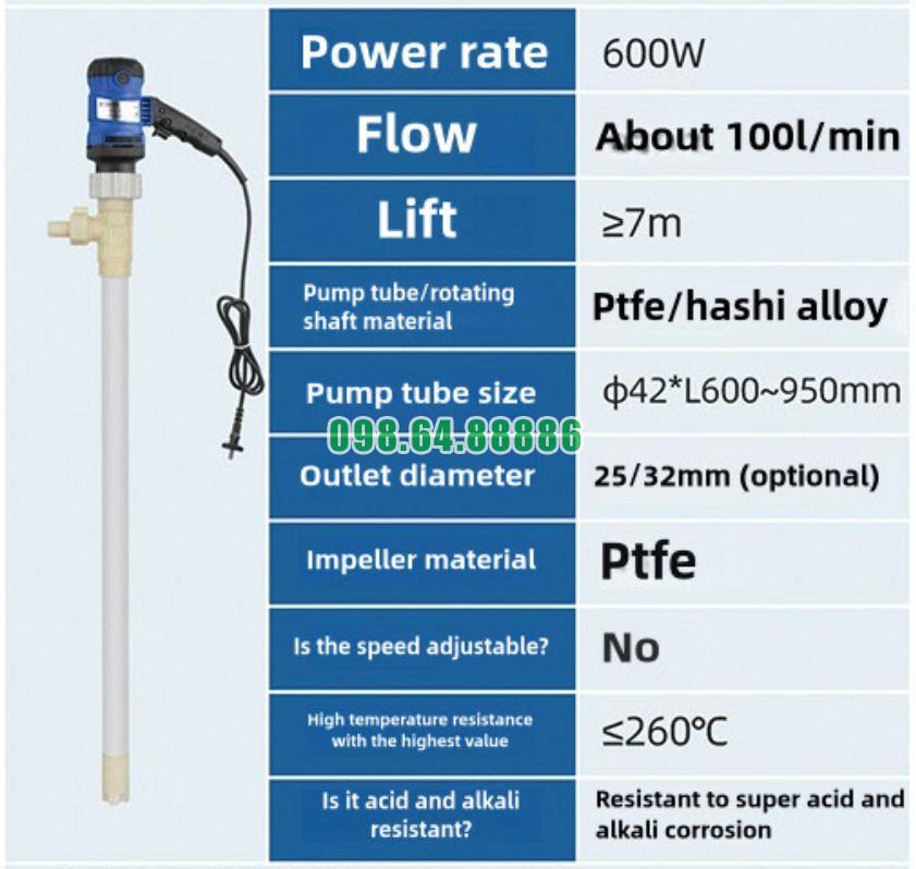 Bơm rút phuy axit – kiềm JDT-600W, vật liệu PTFE