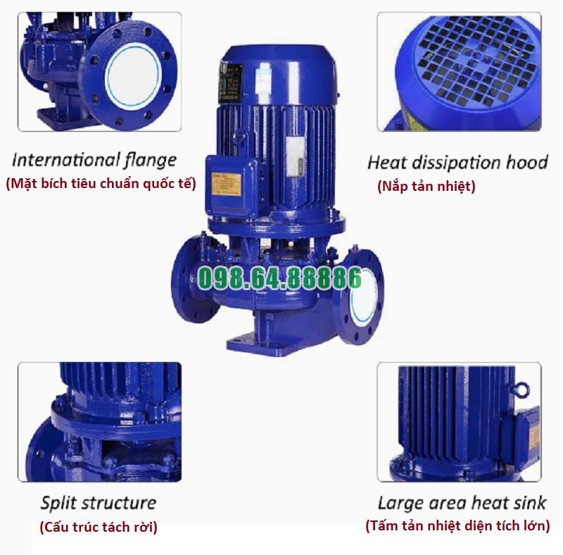 Máy bơm inline, bơm cấp nước trục đứng, bơm lùa ISG80-100, IRG80-100 3kw